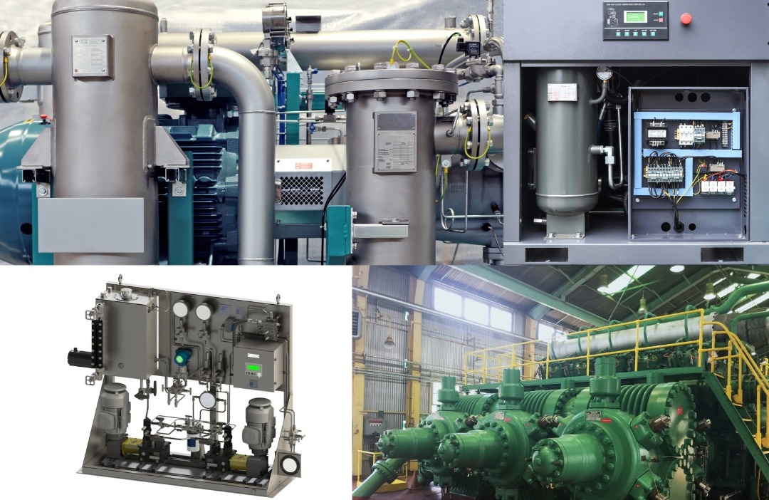 کمپرسورها به لحاظ ساختاری به انواع رفت و برگشتی دیافراگمی سانتریفیوژ اسکرو و وین تقسیم بندی میشوند کمپرسورهای مورد استفاده در صنایع غذایی از هر نوعی که باشند باید بدون روغن کار کنند از این رو کمپرسورهای صنعتی دور بالا علاوه بر استفاده از موتورهای دور متغیر معمولا سیستمهای پایش روانکانکاری و لرزش را نیز شامل می شوند.